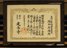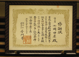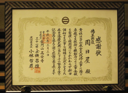 大本山をはじめ各宗派ご寺院様から、佛具納品に際し、感謝状をいただいております。